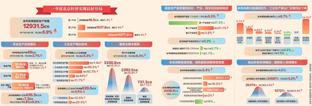 一季度,北京GDP同比增长5.9%,比上年全年提高0.5个百分点,反映出经济运行稳中向好;城镇调查失业率均值为4.0%,就业形势基本稳定;CPI同比上涨0.7%,在去年全年同比略有下降的情况下实现温和回升。新京报记者 姜慧梓